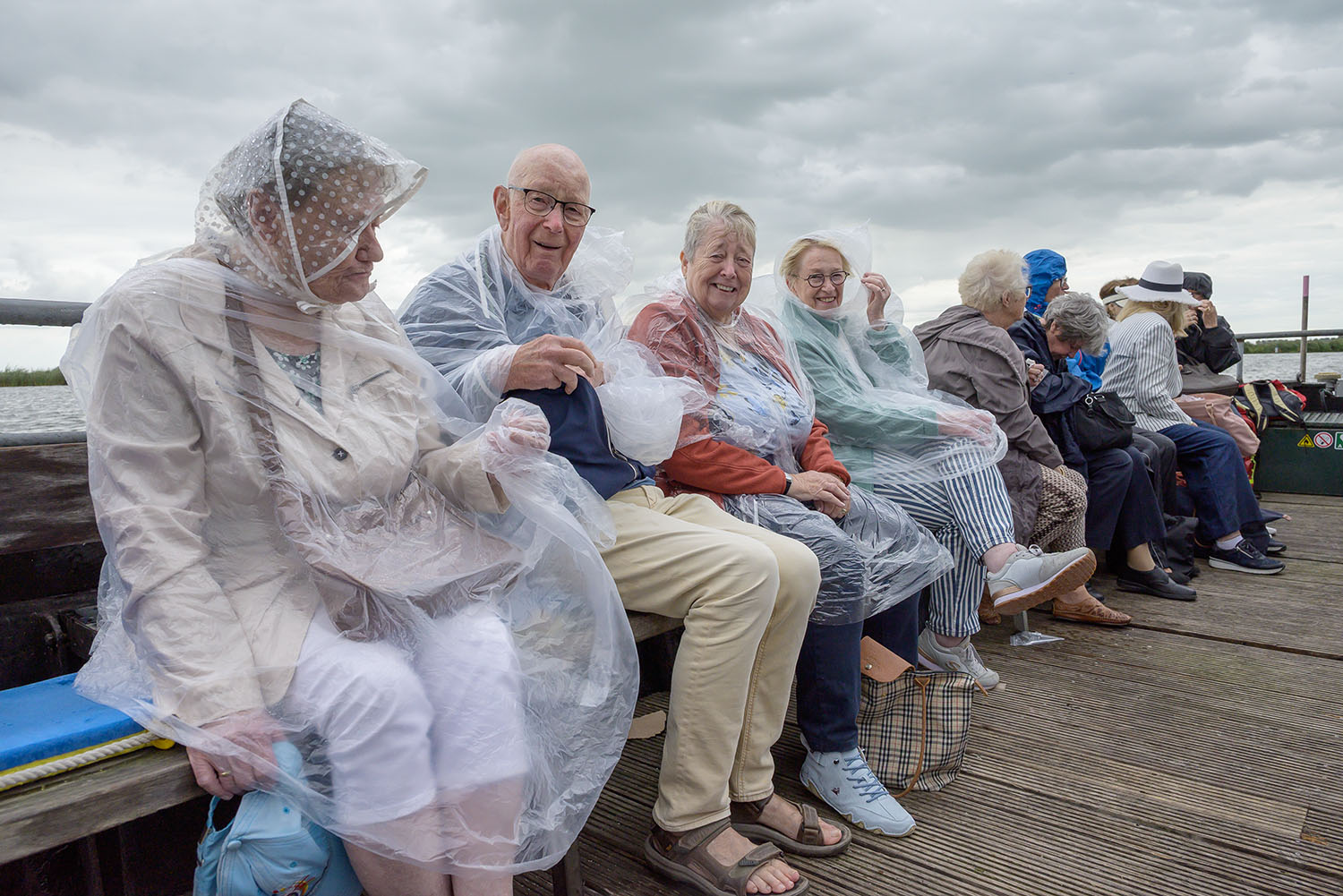 Niet alleen kwamen er letterlijk emmers vol regenwater naar beneden, ook stak er een stevige wind op, die soms zelfs uitmondde in forse stormvlagen. En onze passagiers… wel, die genoten !!