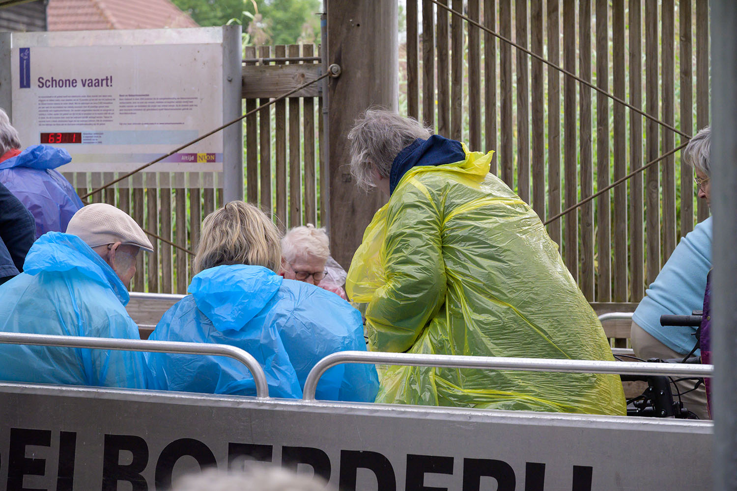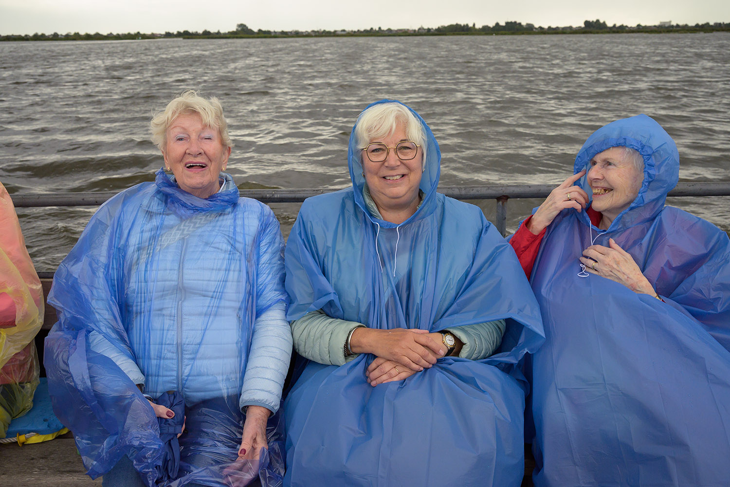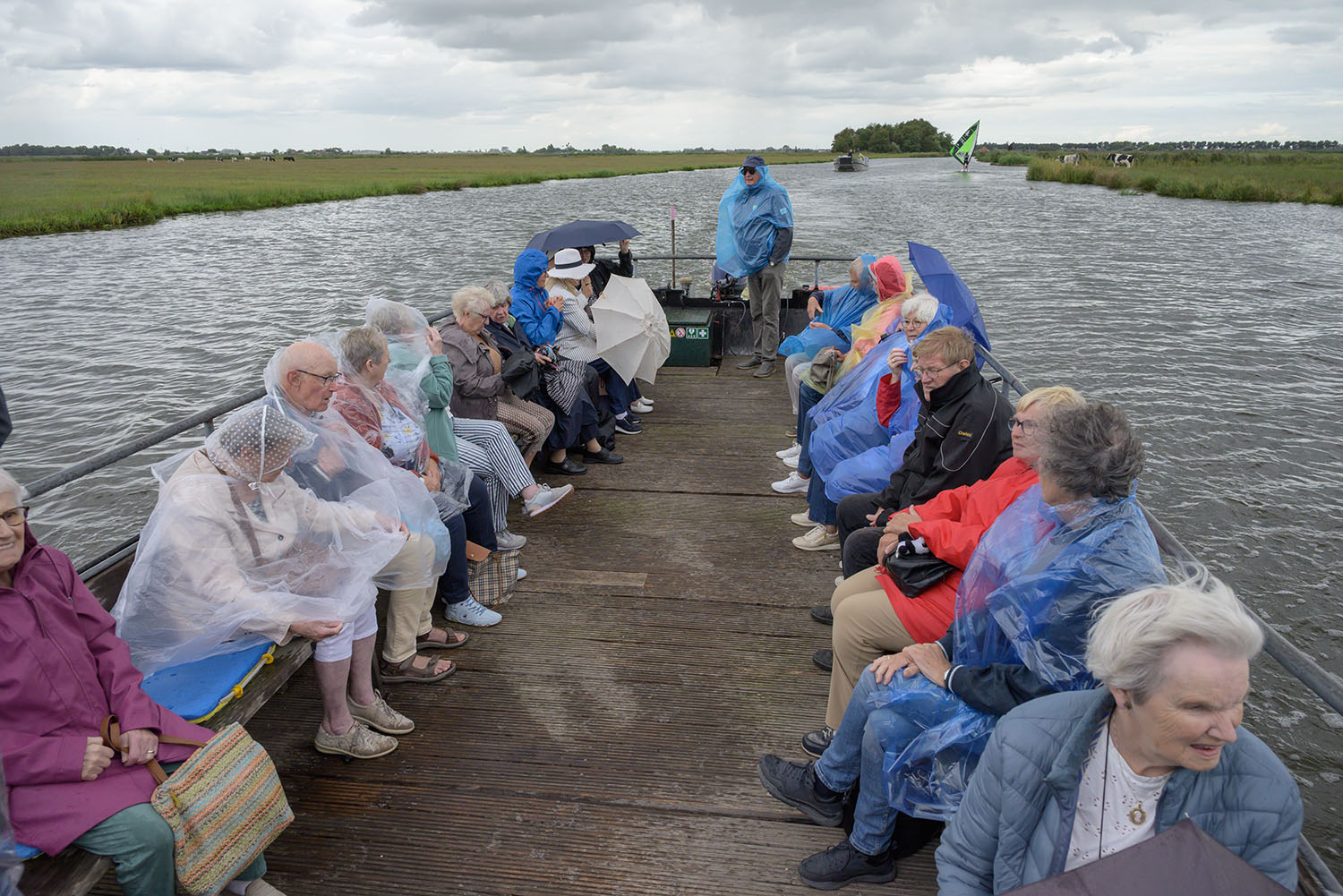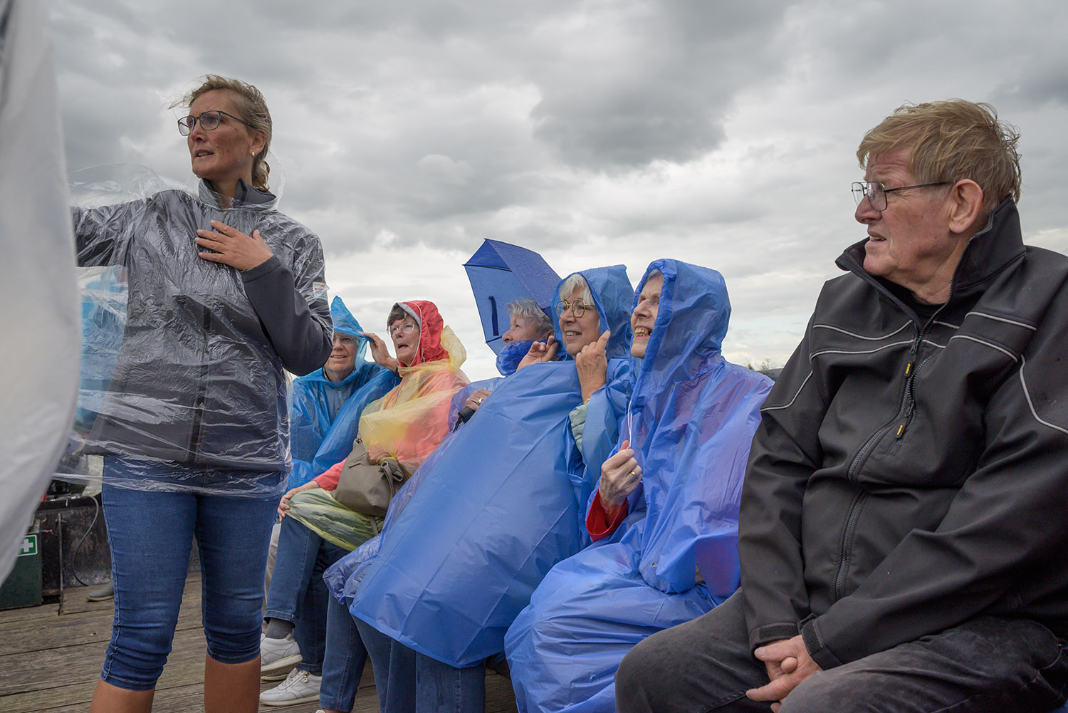 Niet alleen kwamen er letterlijk emmers vol regenwater naar beneden, ook stak er een stevige wind op, die soms zelfs uitmondde in forse stormvlagen. En onze passagiers… wel, die genoten !!