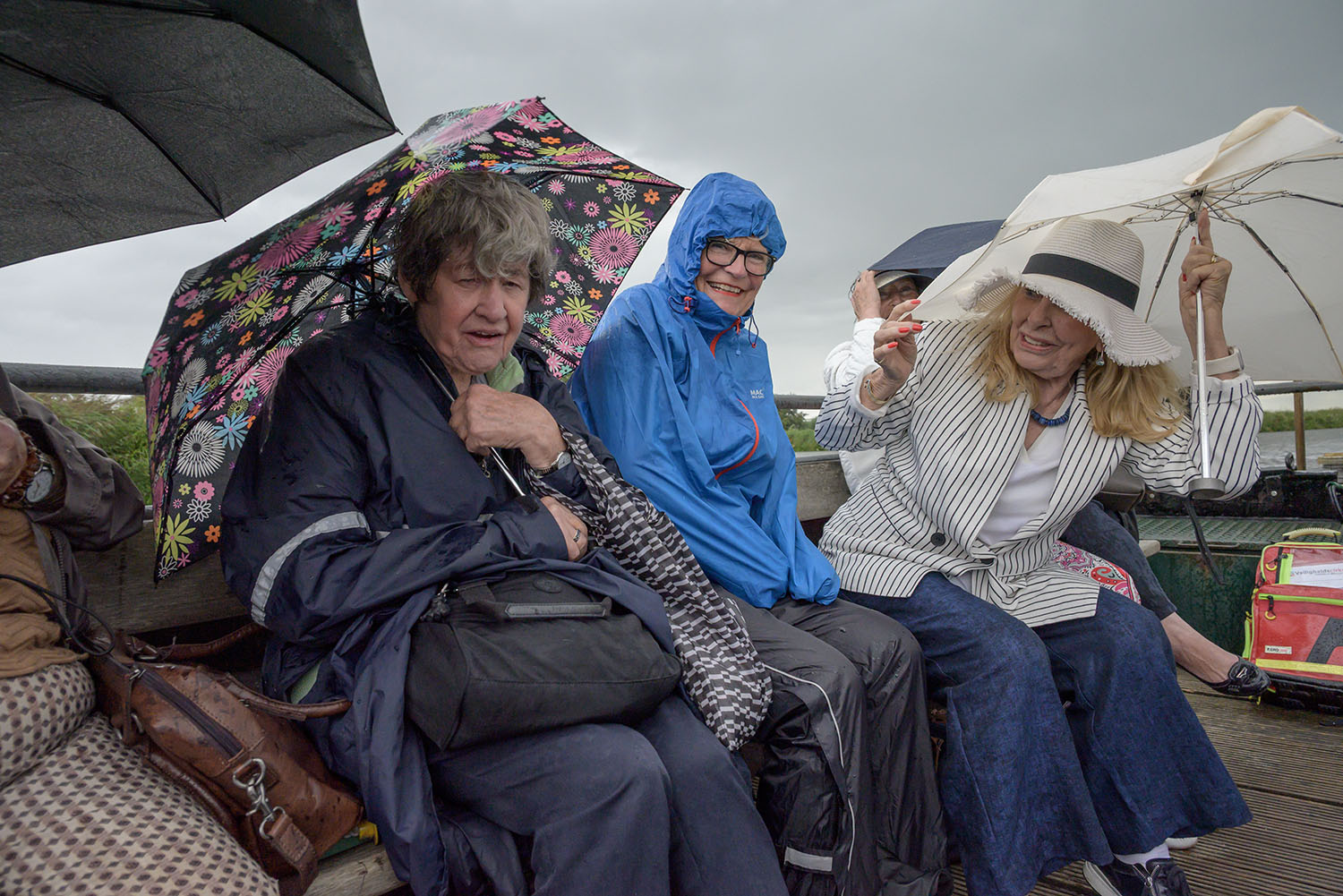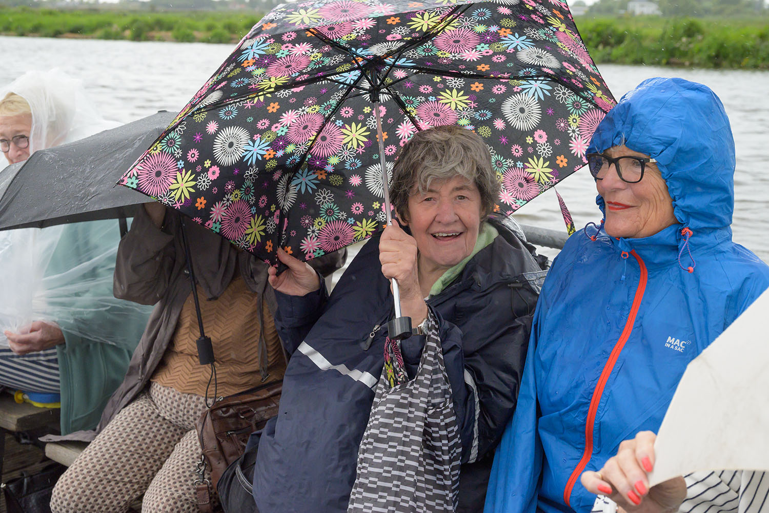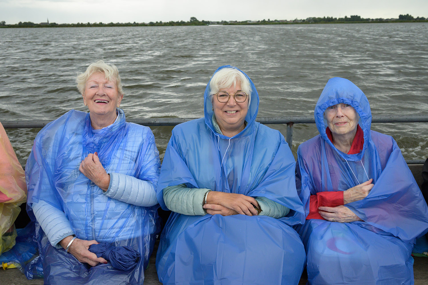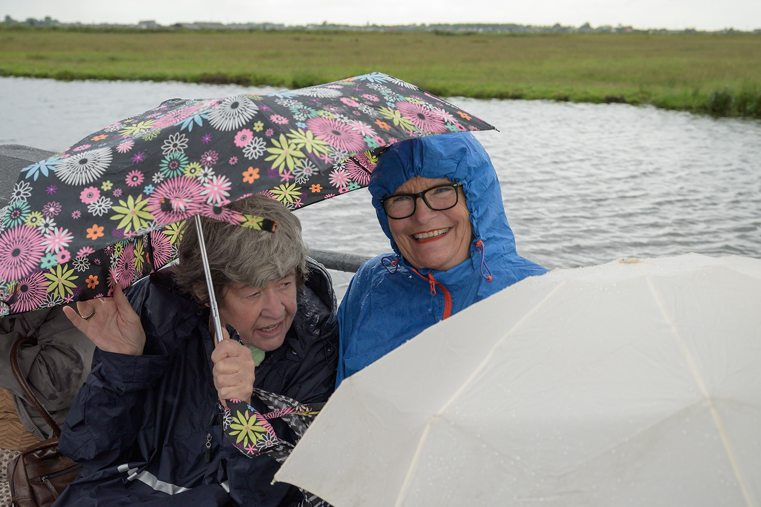 Niet alleen kwamen er letterlijk emmers vol regenwater naar beneden, ook stak er een stevige wind op, die soms zelfs uitmondde in forse stormvlagen. En onze passagiers… wel, die genoten !!