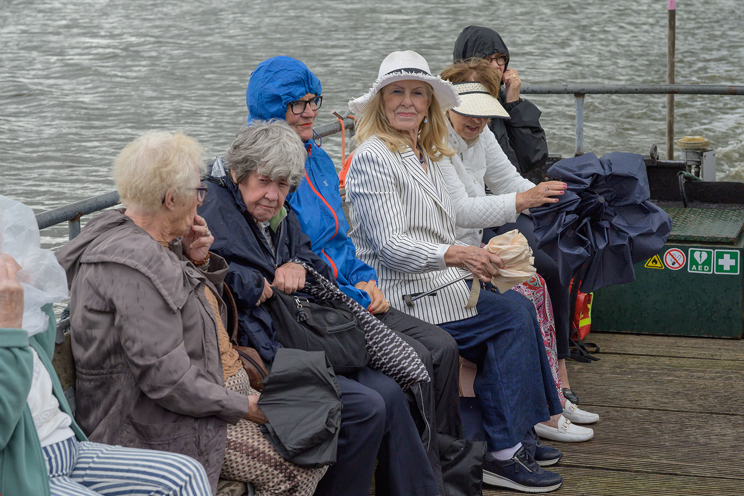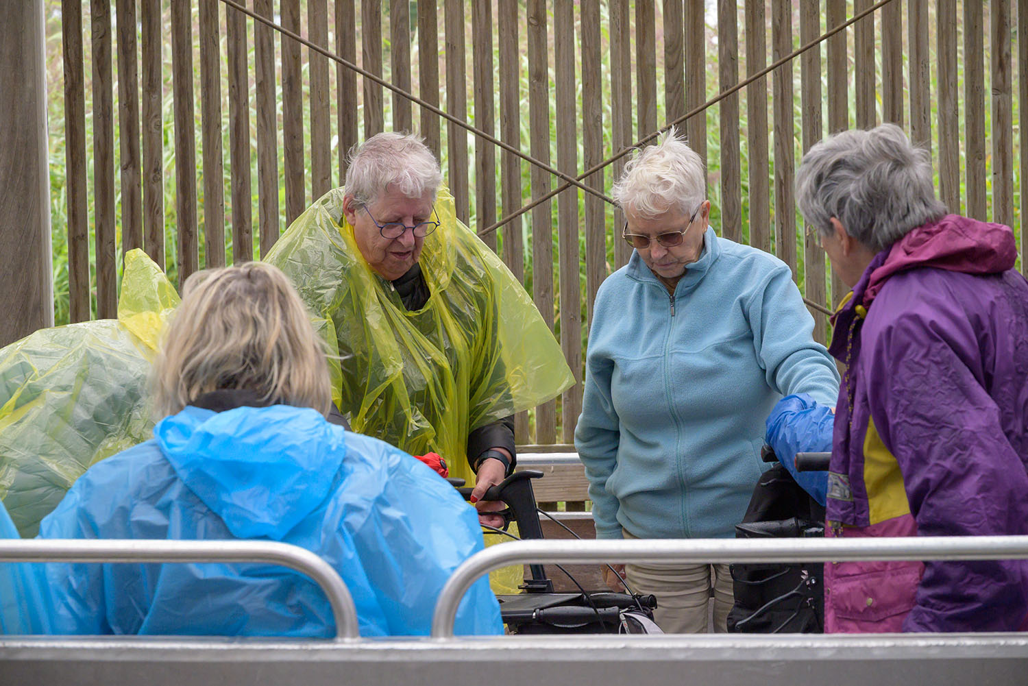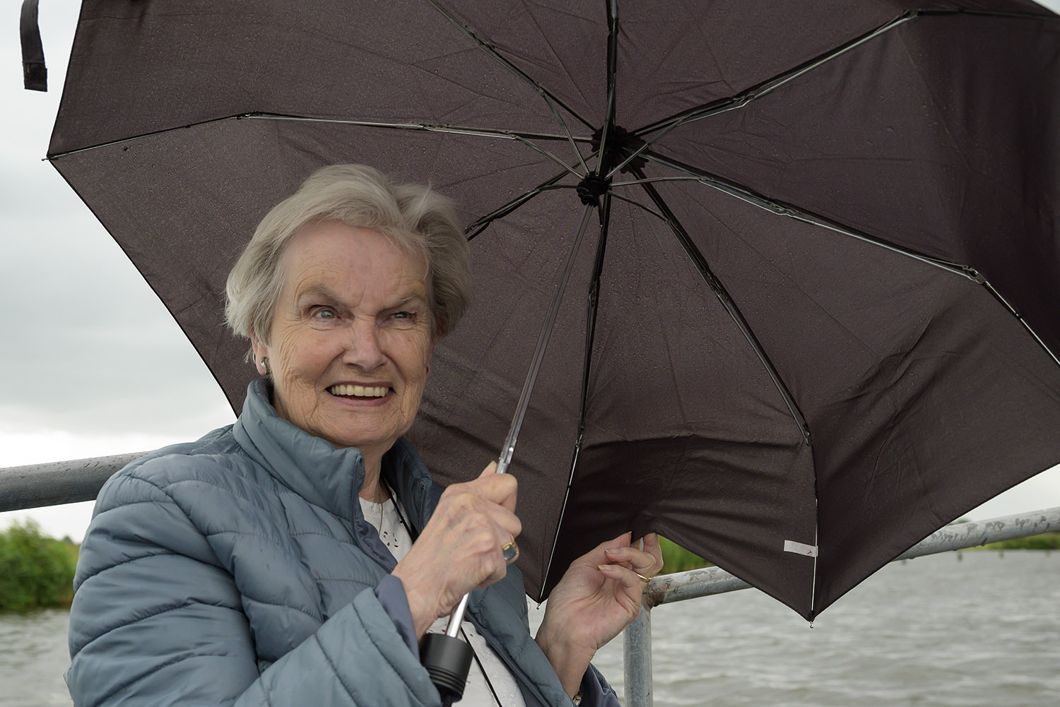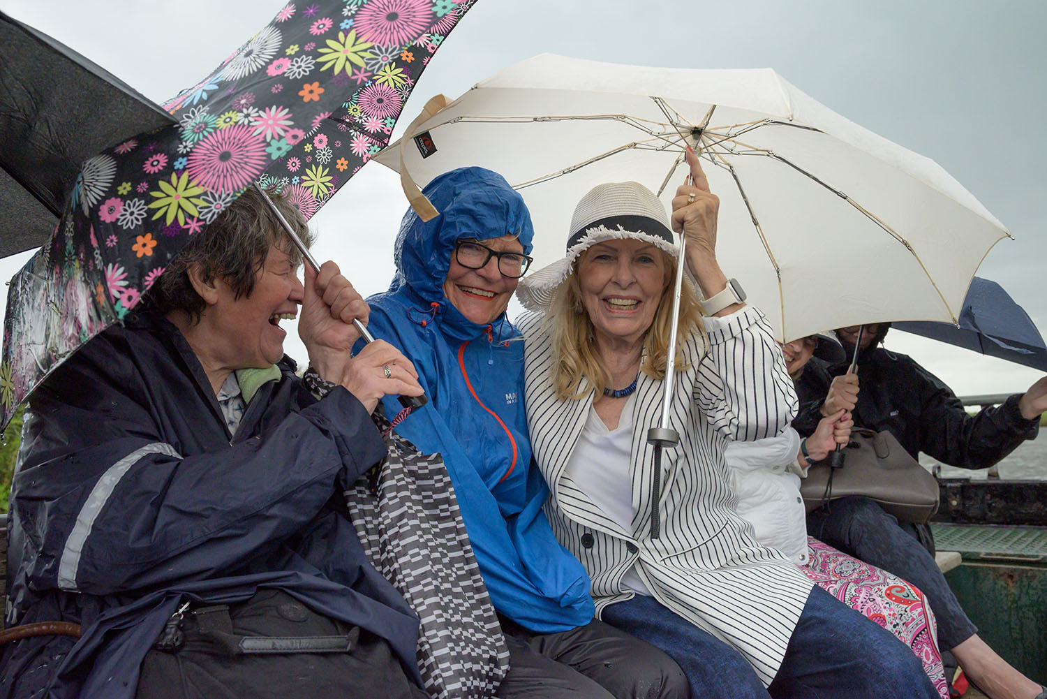 Niet alleen kwamen er letterlijk emmers vol regenwater naar beneden, ook stak er een stevige wind op, die soms zelfs uitmondde in forse stormvlagen. En onze passagiers… wel, die genoten !!