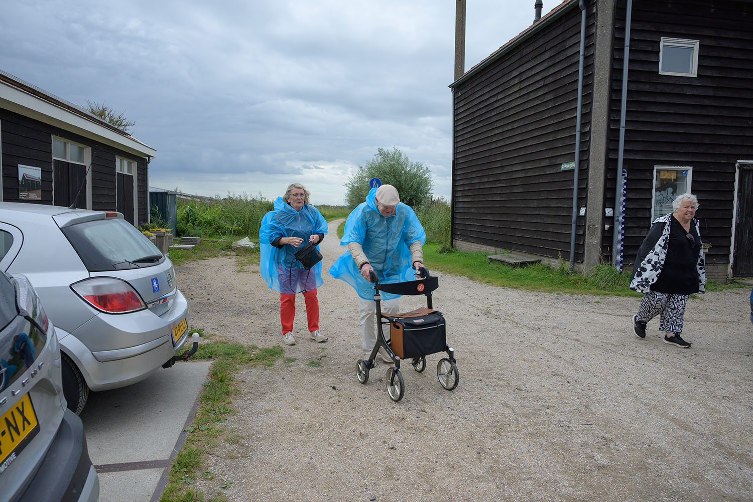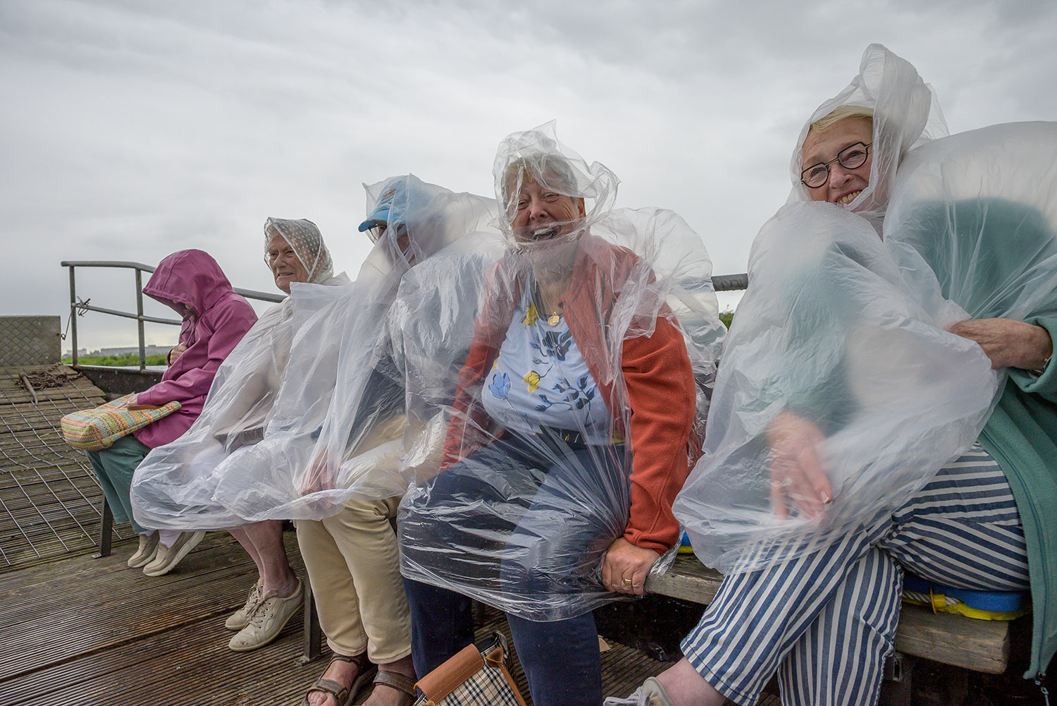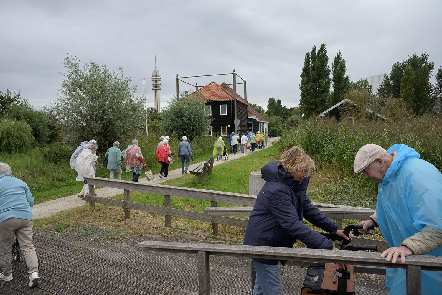 Want onze Zaankanters, ook niet voor een kleintje vervaard, hadden gerekend op dit echte Hollandse weer en een paar Hollandse buitjes, dus kwamen van alle kanten de plastic poncho’s, plastic zakken en paraplu’s te voorschijn.
