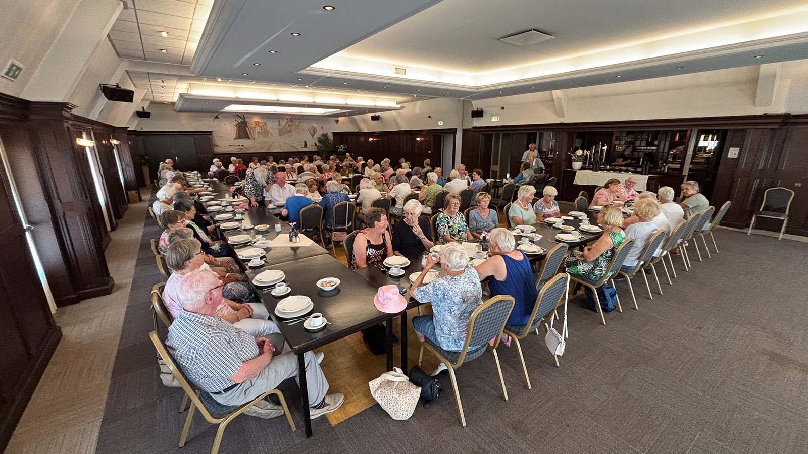 In Joure bij partycentrum It Haske kregen we een lunch aangeboden. We begonnen met soep, tomaten of groenten, en daarna werden diverse soorten brood op tafel gezet. Het beleg bestond uit verschillende soorten vleeswaren, twee soorten kaas, jam en hagelslag. Sommigen van ons miste de kroketten, maar met het hete weer was het misschien beter zo. Voor de vochthuishouding was er koffie, thee, melk, karnemelk en water. Dus veel drinken met deze hitte en dat hadden ook de organisatoren van dit uitje zeker gedacht, want bij terugkomst in de bus lag er op iedere stoel een flesje water.