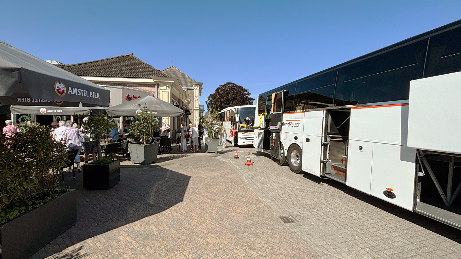 Maar toen iedereen een plekje in de bussen gevonden had, konden we wel, zei het iets later, vertrekken.