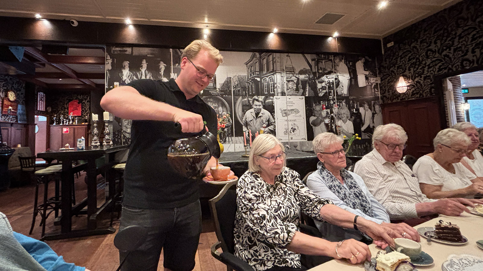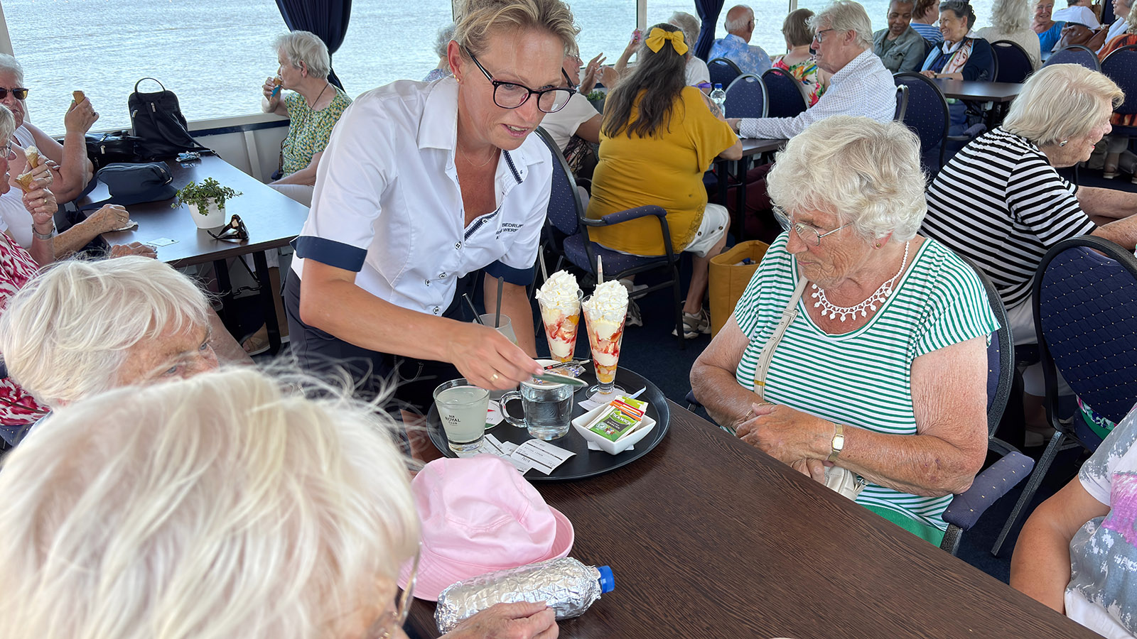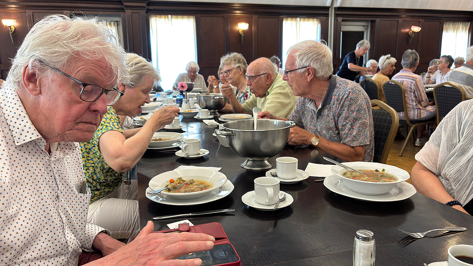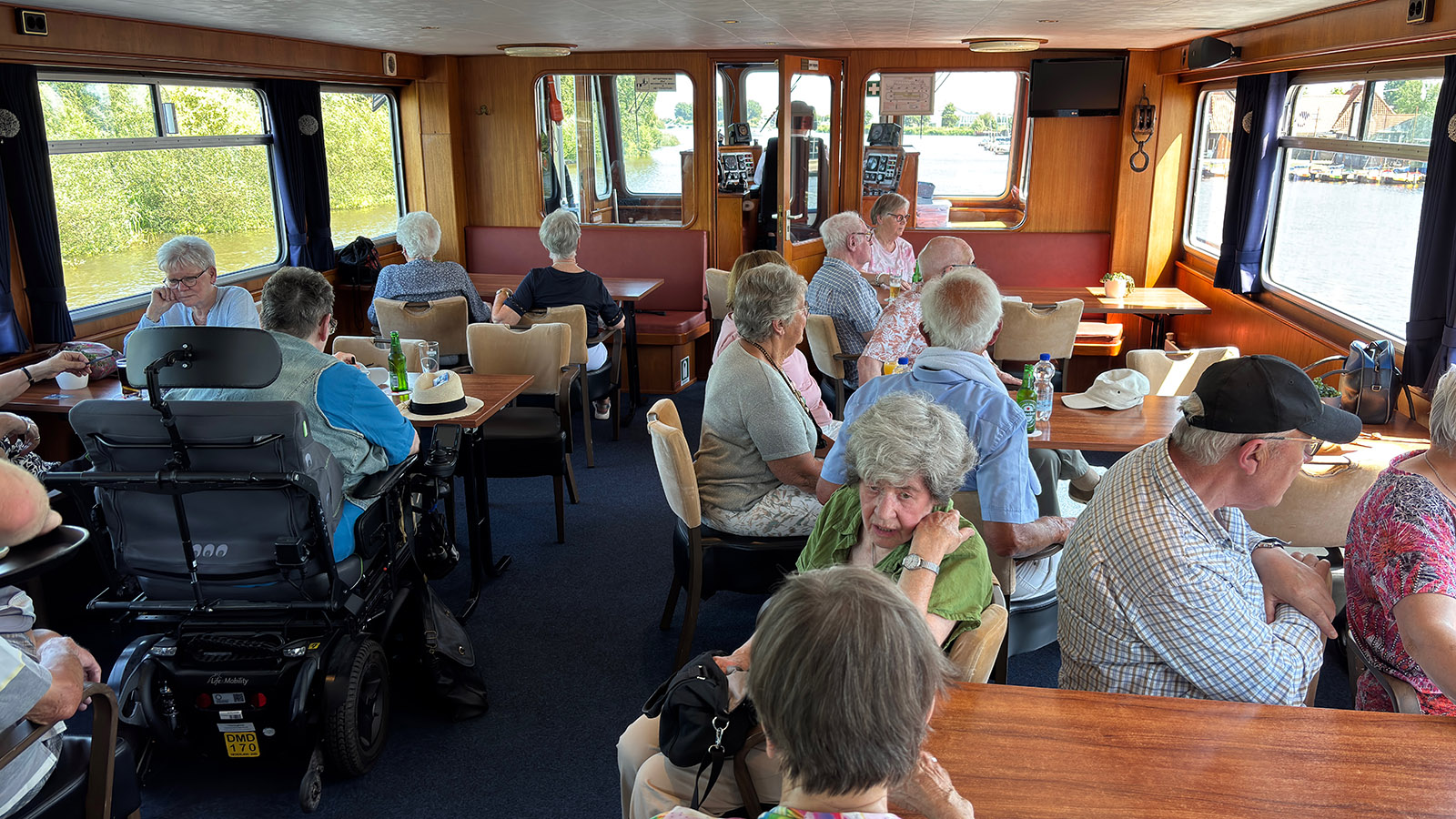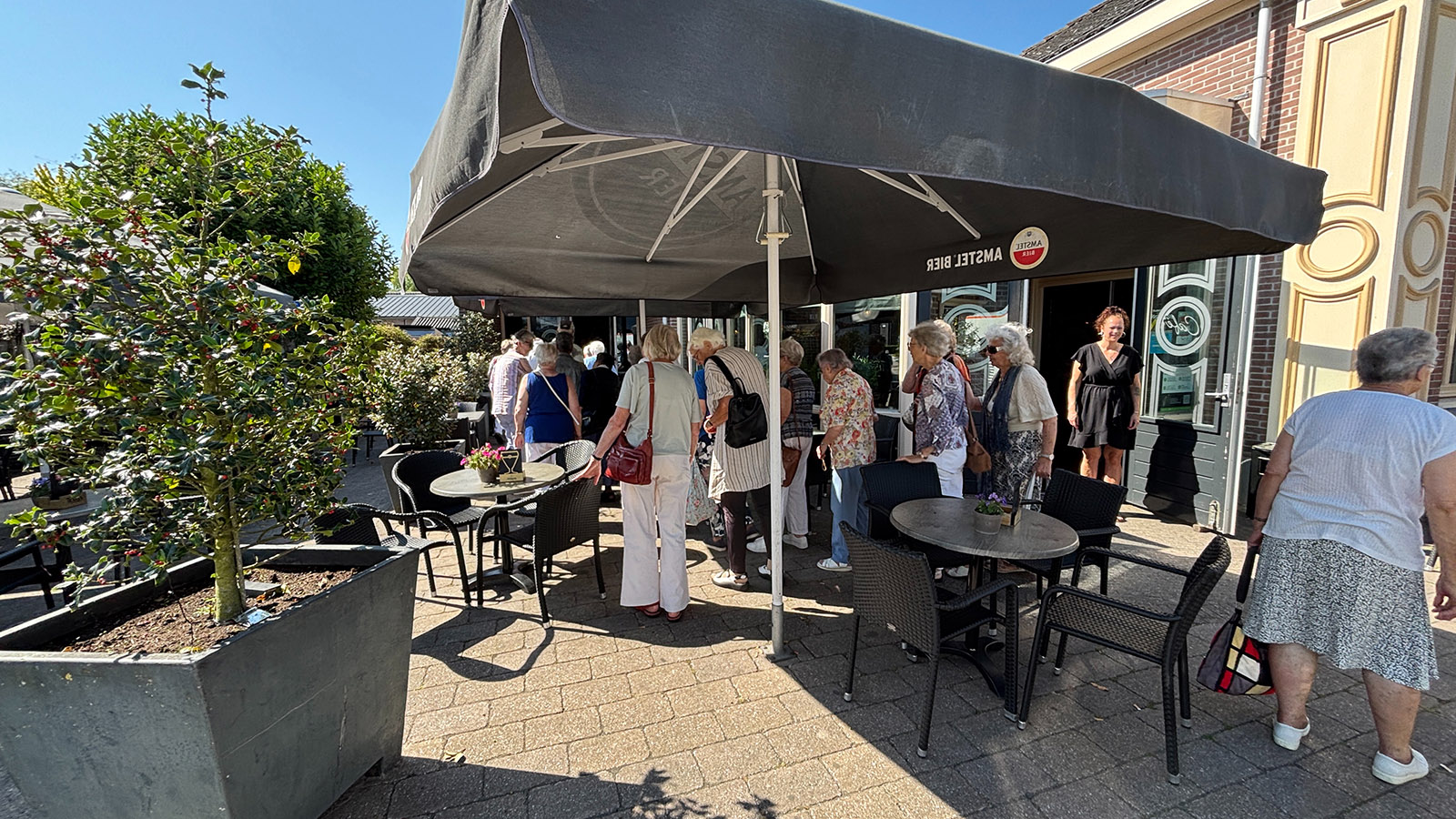 In Joure bij partycentrum It Haske kregen we een lunch aangeboden. We begonnen met soep, tomaten of groenten, en daarna werden diverse soorten brood op tafel gezet. Het beleg bestond uit verschillende soorten vleeswaren, twee soorten kaas, jam en hagelslag. Sommigen van ons miste de kroketten, maar met het hete weer was het misschien beter zo. Voor de vochthuishouding was er koffie, thee, melk, karnemelk en water. Dus veel drinken met deze hitte en dat hadden ook de organisatoren van dit uitje zeker gedacht, want bij terugkomst in de bus lag er op iedere stoel een flesje water.