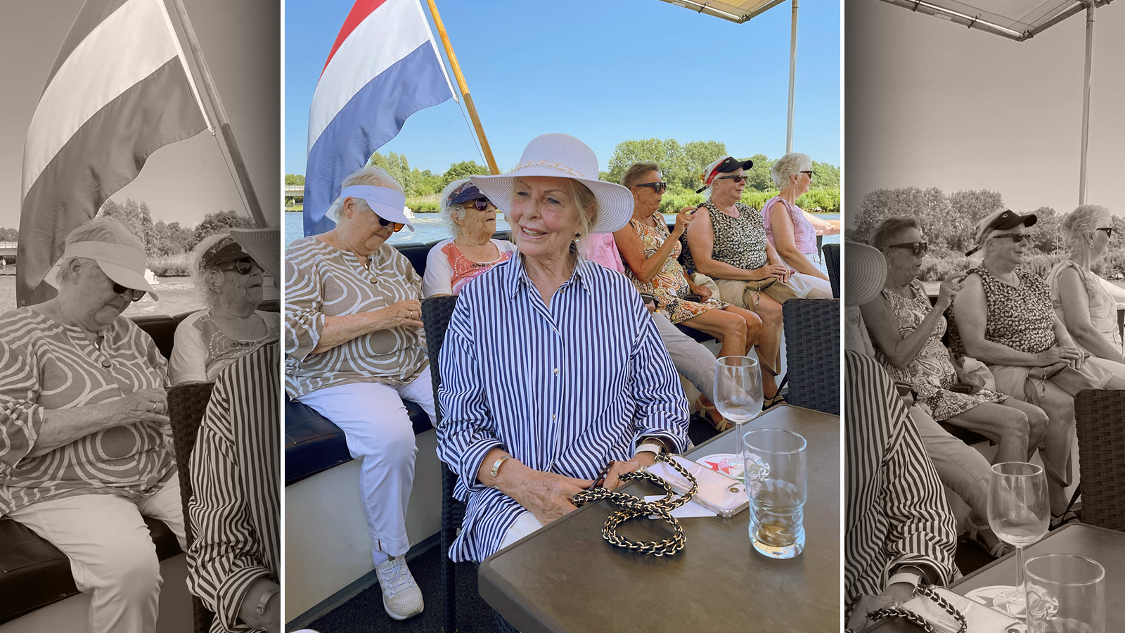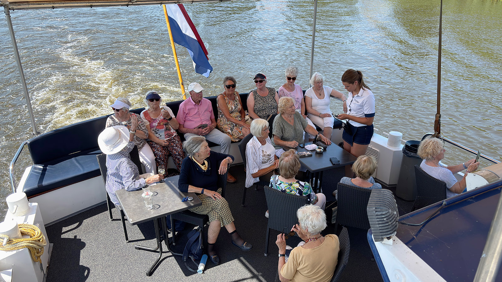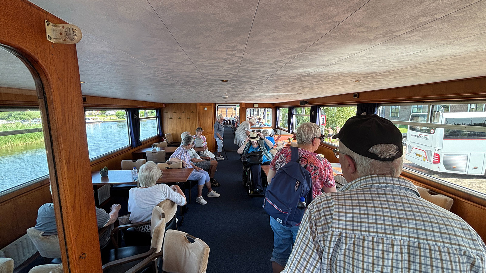 Op naar Sneek. Daar aangekomen lag de boot genaamd ‘De Toerist’ van het rondvaartbedrijf M. van der Werf al langs de kade. Genoeg hulpvaardige handen zodat iedereen veilig aan boord kwam. Het overgrote deel zocht een plaatsje binnen, uit de zon. Er zou airco op de boot zijn. Maar ik denk dat de airco de openstaande ramen waren. Varend uit Sneek ging het over het ‘Prinses Margrietkanaal’, over het meer ‘Aldhôf’, linksaf over het ‘Prinses Margrietkanaal’. Vervolgens rechtsaf over het ‘Jeltesleat’ over het aquaduct waar de N354 onderdoor gaat, en dan linksaf over het ‘Nouwe Wimerts’ en zo voeren we naar Woudsend. Maar dat had u natuurlijk ook allemaal herkend.