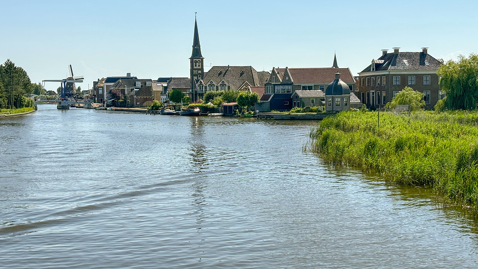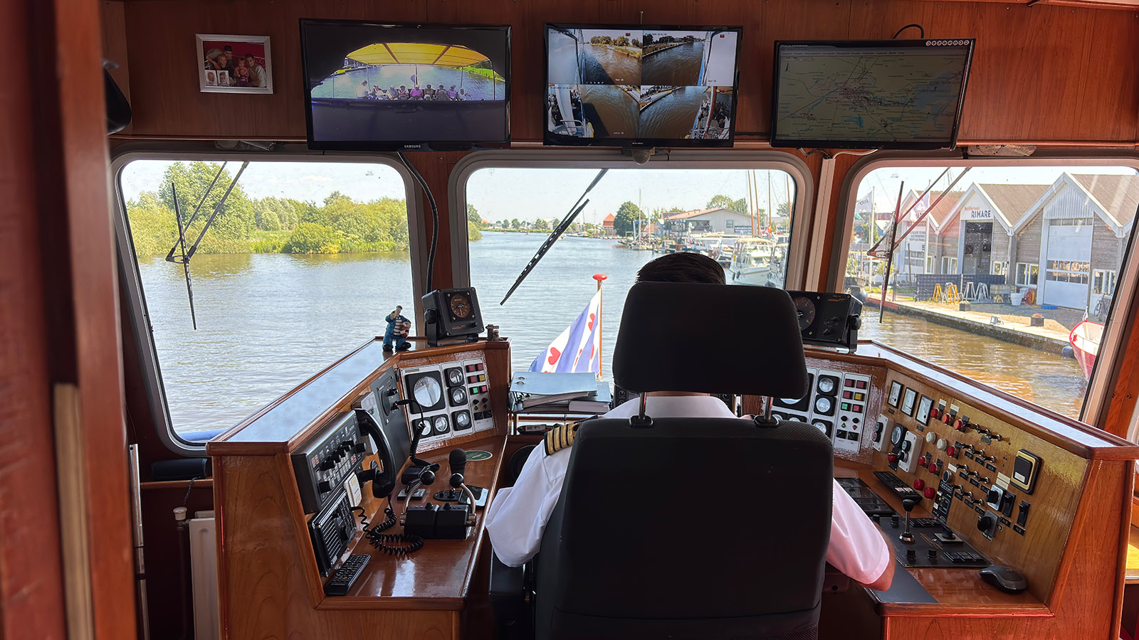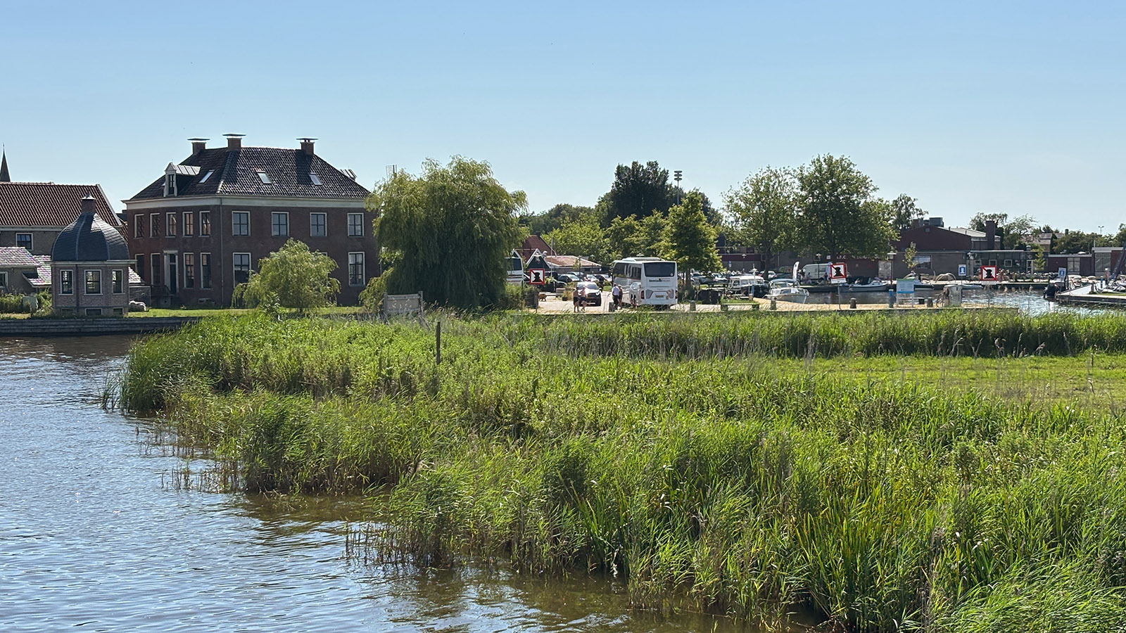 Op naar Sneek. Daar aangekomen lag de boot genaamd ‘De Toerist’ van het rondvaartbedrijf M. van der Werf al langs de kade. Genoeg hulpvaardige handen zodat iedereen veilig aan boord kwam. Het overgrote deel zocht een plaatsje binnen, uit de zon. Er zou airco op de boot zijn. Maar ik denk dat de airco de openstaande ramen waren. Varend uit Sneek ging het over het ‘Prinses Margrietkanaal’, over het meer ‘Aldhôf’, linksaf over het ‘Prinses Margrietkanaal’. Vervolgens rechtsaf over het ‘Jeltesleat’ over het aquaduct waar de N354 onderdoor gaat, en dan linksaf over het ‘Nouwe Wimerts’ en zo voeren we naar Woudsend. Maar dat had u natuurlijk ook allemaal herkend.