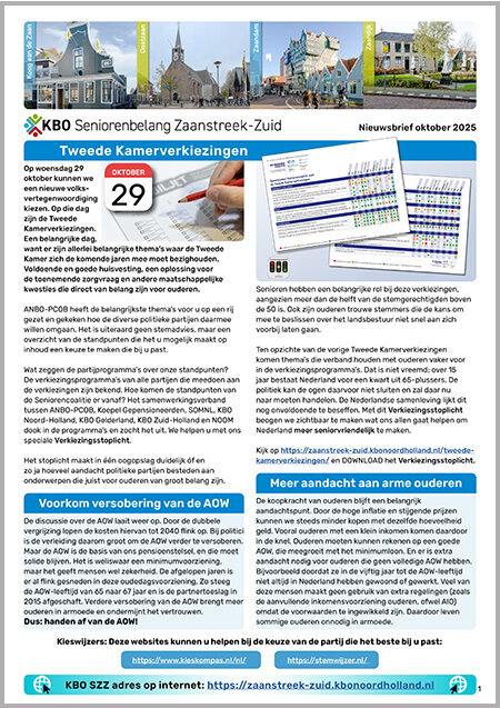 U bevindt zich op de Nieuwsbrief pagina van KBO Seniorenbelang Zaanstreek Zuid. Hier kunt u een Nieuwsbrief openen door op een afbeelding van een Nieuwsbrief te klikken. Dan leest u de Nieuwsbrief on-line. Een praktisch voordeel hiervan is dat verwijzigingen (linken) naar pagina’s op onze website maar ook verwijzigingen naar andere websites en/of e-mail adressen actief zijn. Door op zo’n verwijzing te klikken gaat u automatisch naar een andere pagina, website of start uw e-mail programma om een e-mail te versturen.